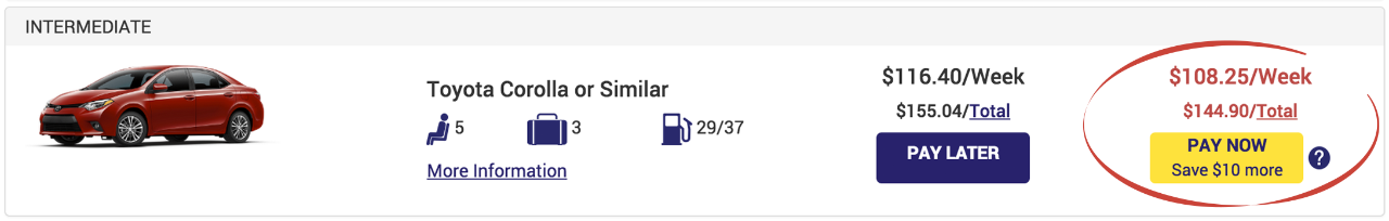 Pay Now discounts apply to base time and mileage rates only. Taxes, fees, surcharges, and optional items (insurance/coverage, car seats, GPS, additional drivers, etc.) are excluded.