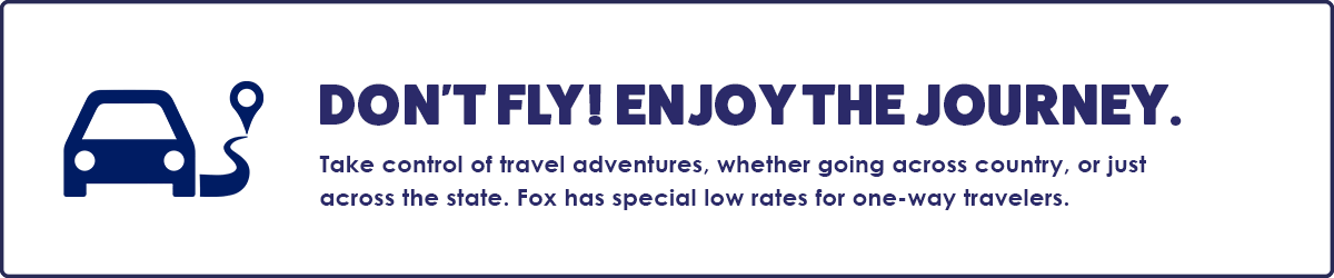 Fox offers you more convenience and value with one-way car rentals at competitive low rates. Get unlimited mileage, easy one-way pick-up and returns, and low-cost 24-hour emergency roadside assistance at Fox’s corporate locations.
