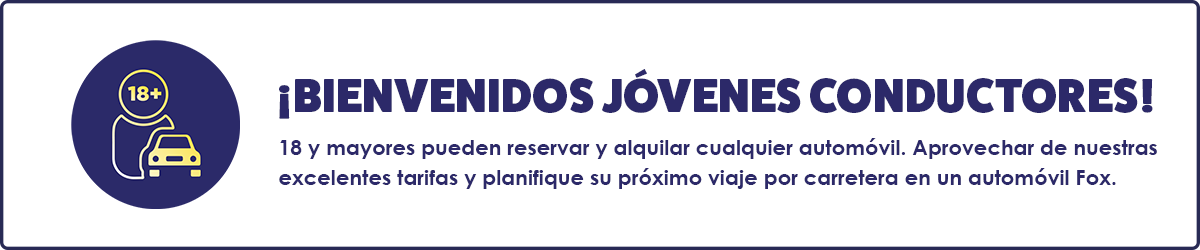 ¡No permita que su edad le impida alquilar un vehículo para su próximo viaje a casa después de la universidad, vacaciones o viaje por carretera! Si tiene una licencia de conducir válida de los Estados Unidos, puede alquilar un automóvil en Fox. Se aplican tarifas adicionales para todos los conductores menores de edad.